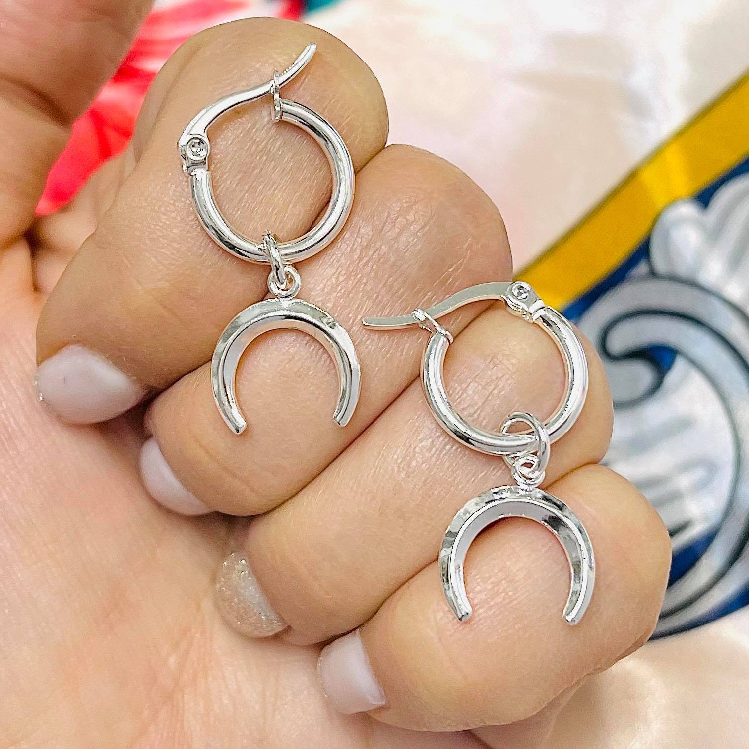 Aros Argolla con Colgante Luna Invertida de Acero Blanco