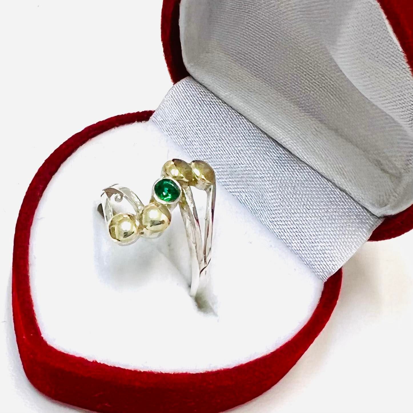 anillo zic zac con cubic esmeralda de PLata y Oro