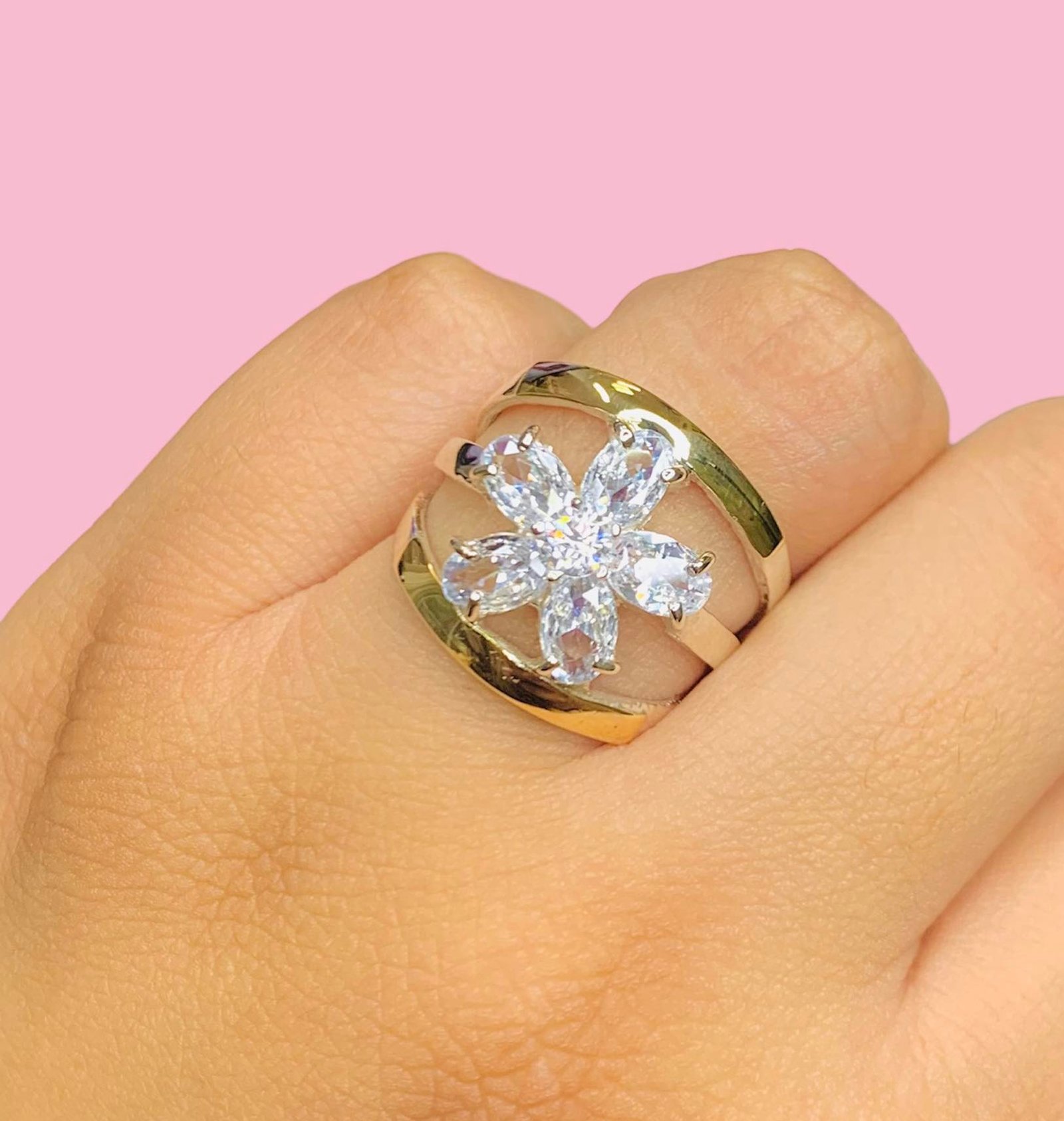Anillo Flor con Cubic Blanco de Plata y Oro
