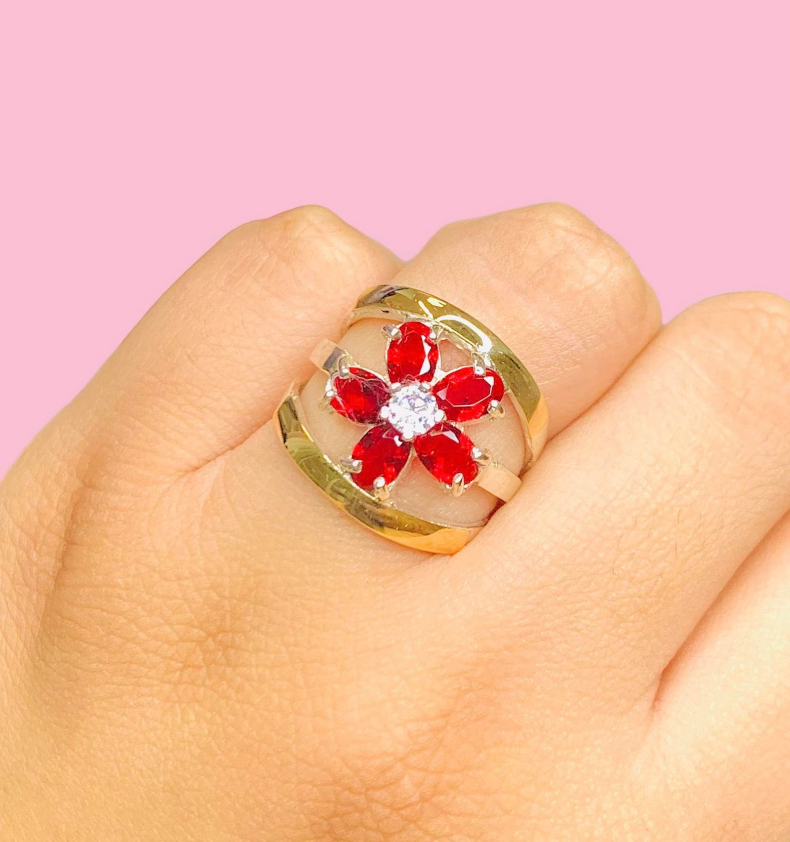 Anillo flor con cubic Rubi de Plata y Oro