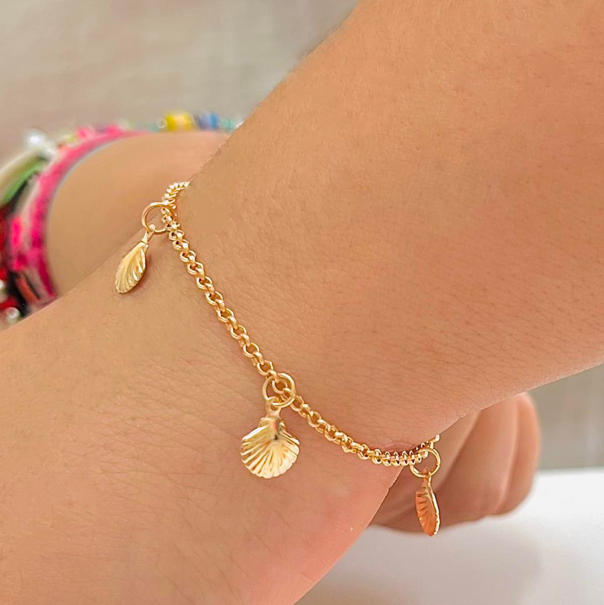 Pulsera rolito con dijes caracol - ostra baño de oro Rose