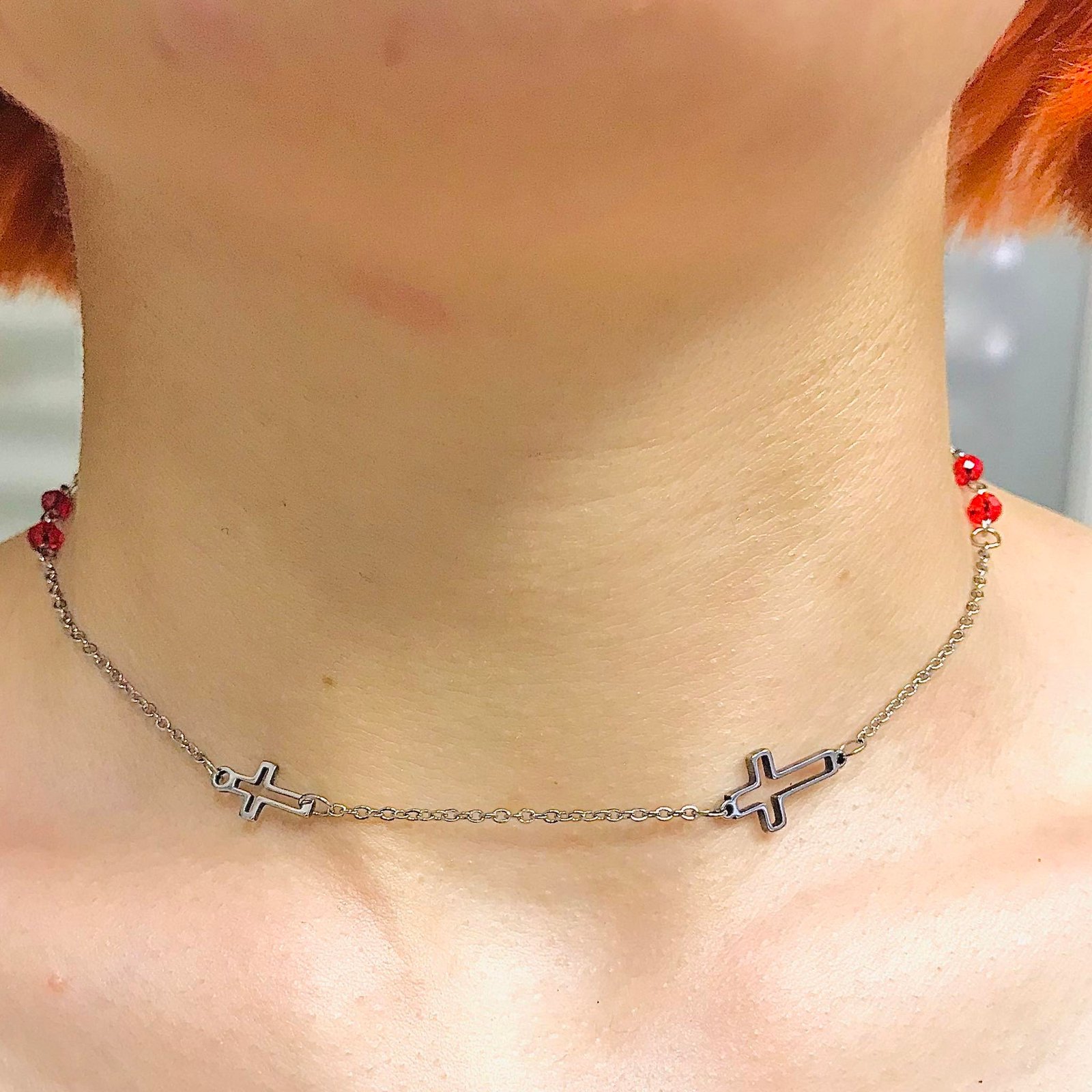 Gargantilla con Cruz y Piedras Rojas de Acero Quirurgico