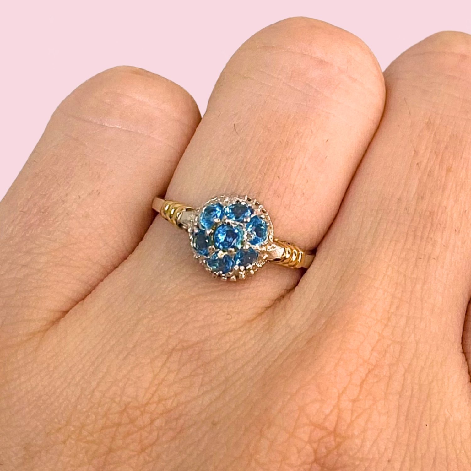 » anillo frutillita con cubic aguamarina Plata y Oro