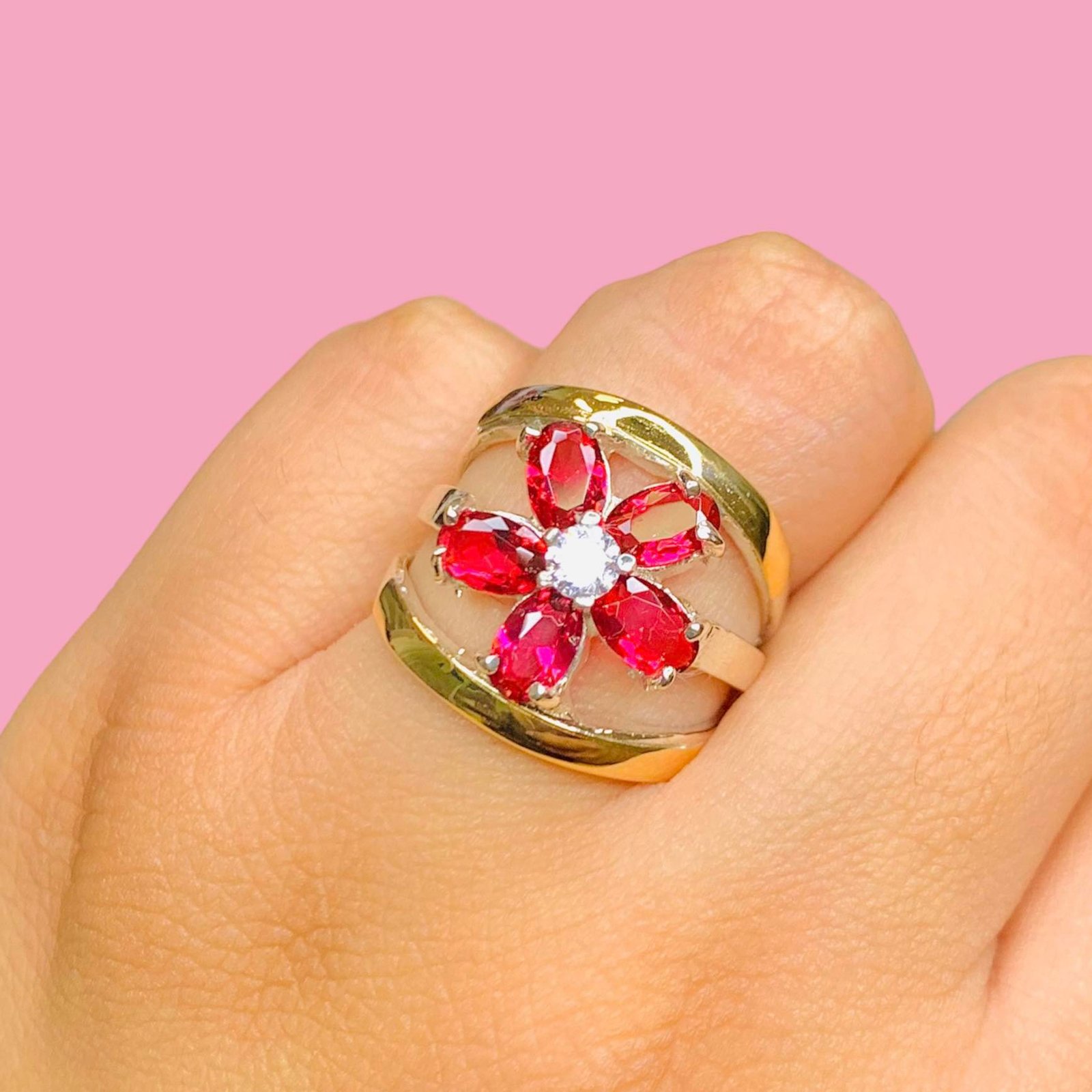 Anillo flor con cubic Fucsia de Plata y Oro