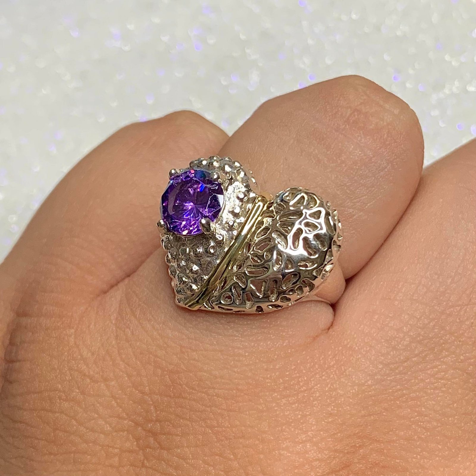 Anillo Corazon con cubic AMATISTA de Plata y Oro