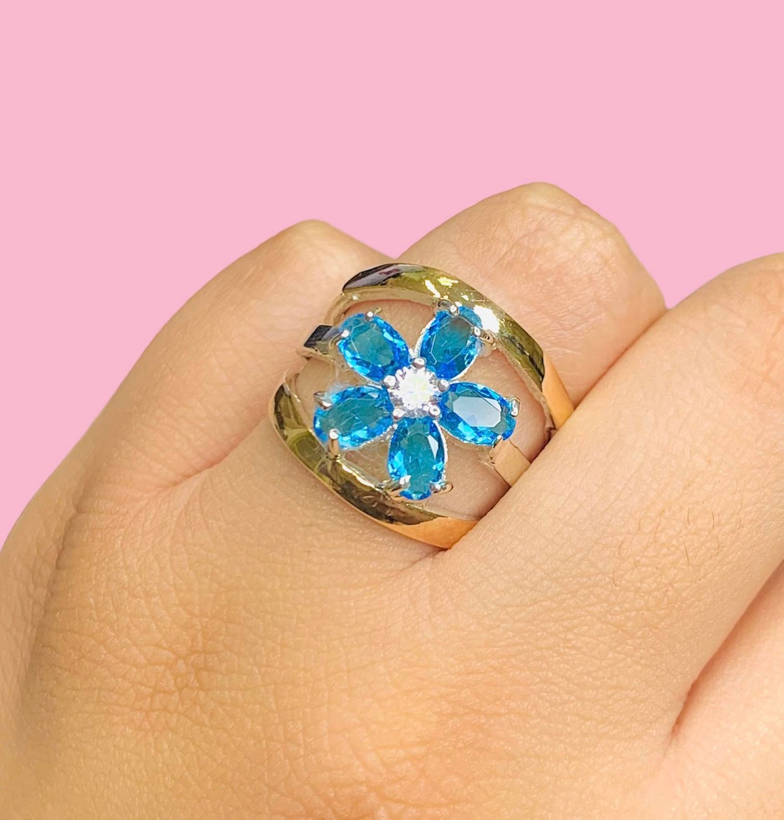 Anillo flor con cubic Agua Marina de Plata y Oro