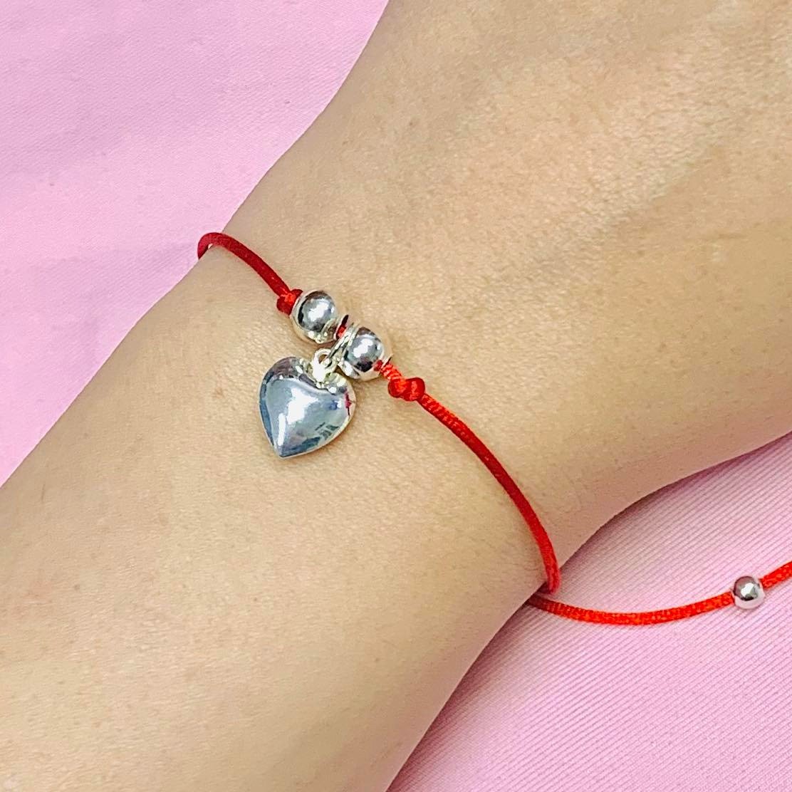 Pulsera Hilo rojo con Corazon colgante y bolitas de Plata 925
