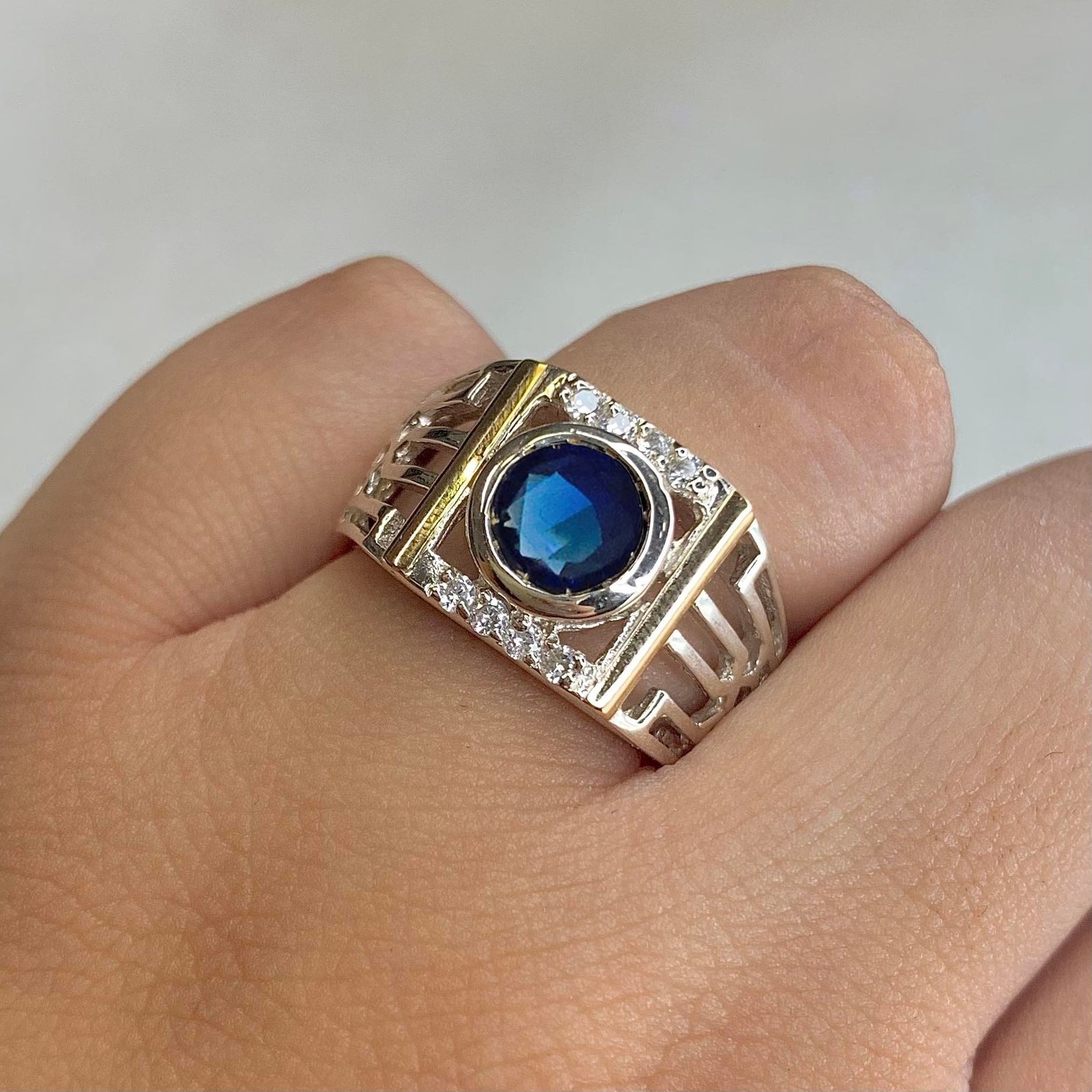 Anillo hombre calado con cubic zafiro de Plata y Oro