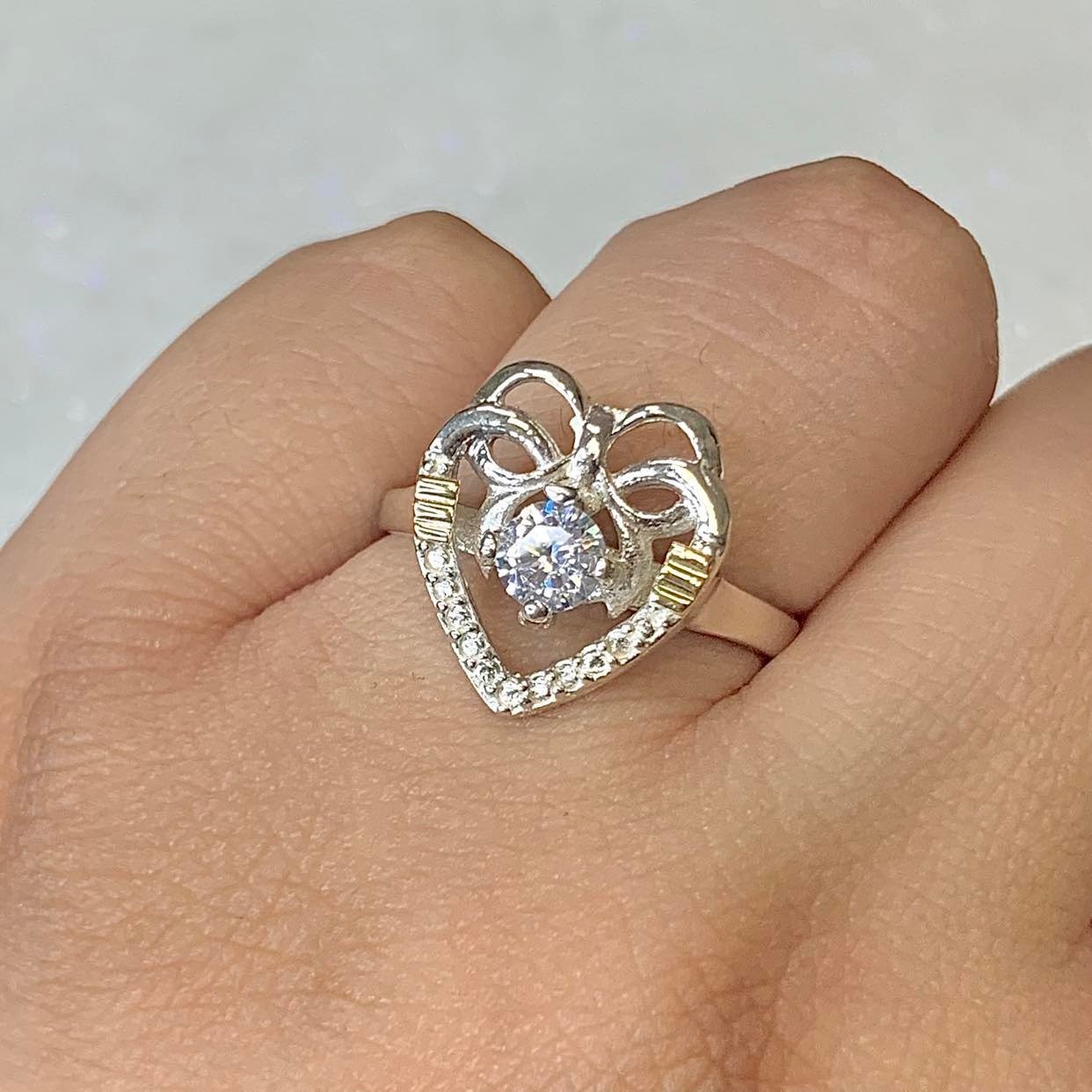 anillo corazon moño con cubic blanco de Plata y Oro