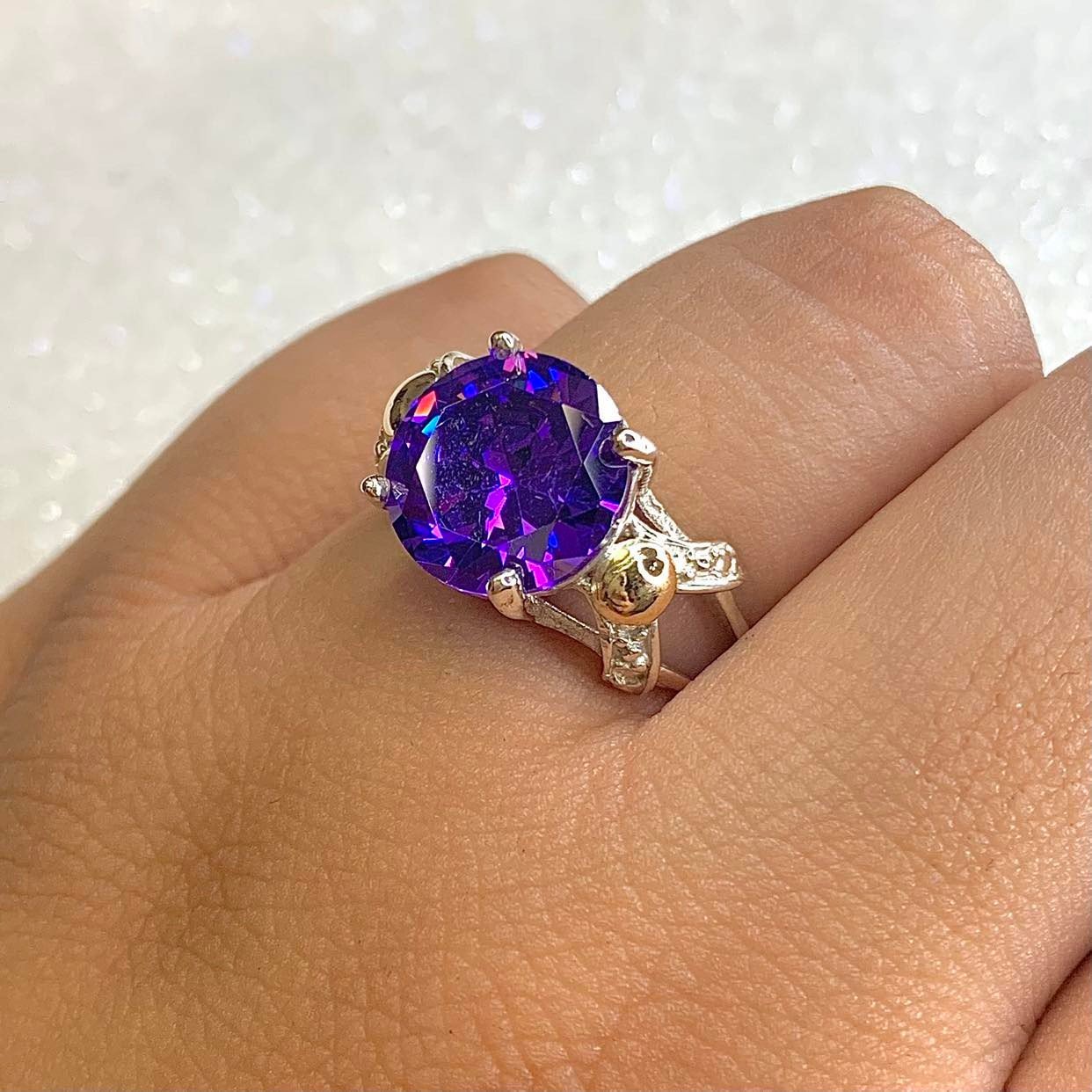 anillo con cubic redondo amatista de Plata y Oro
