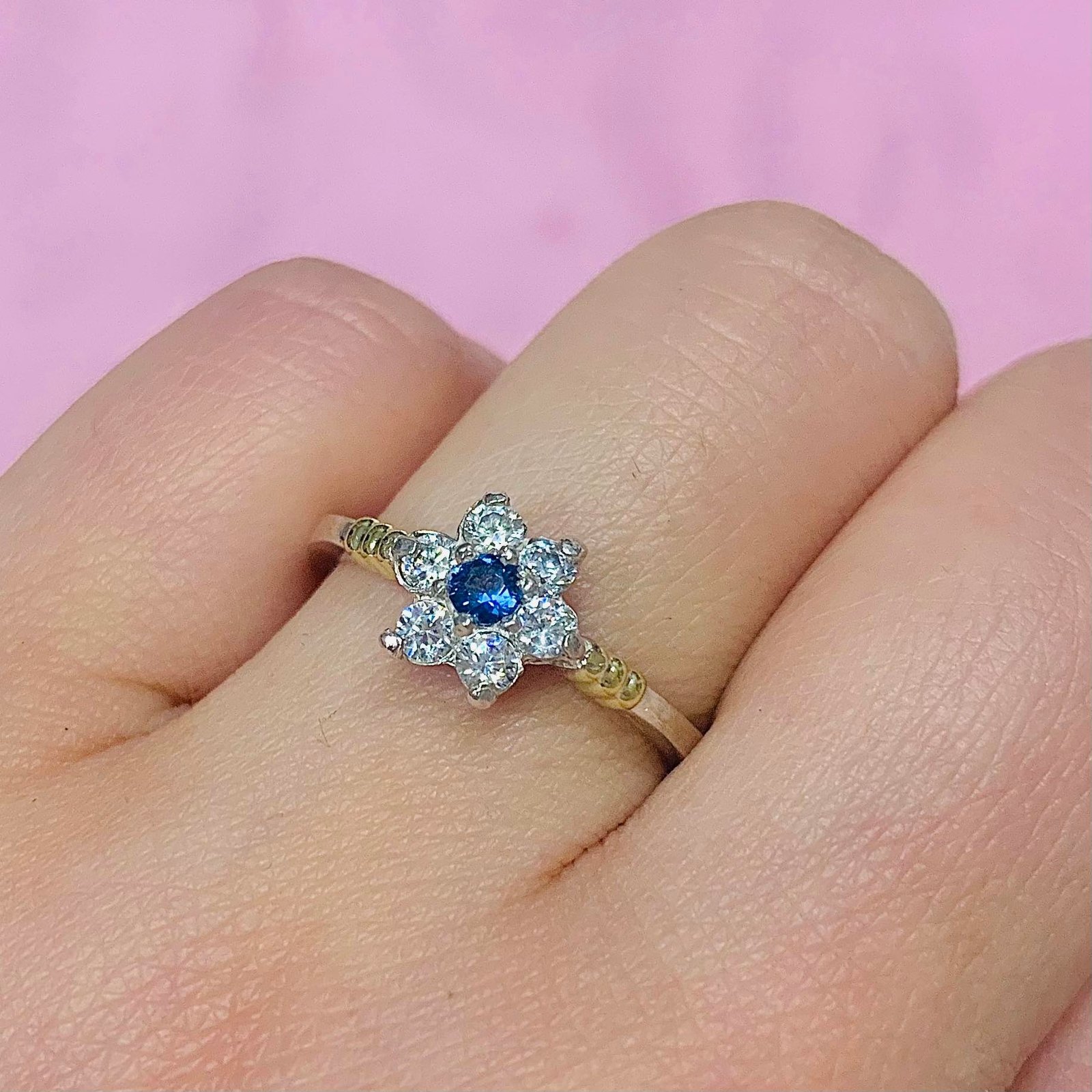 Anillo Roseta Blanco y centro Azul Plata y Oro