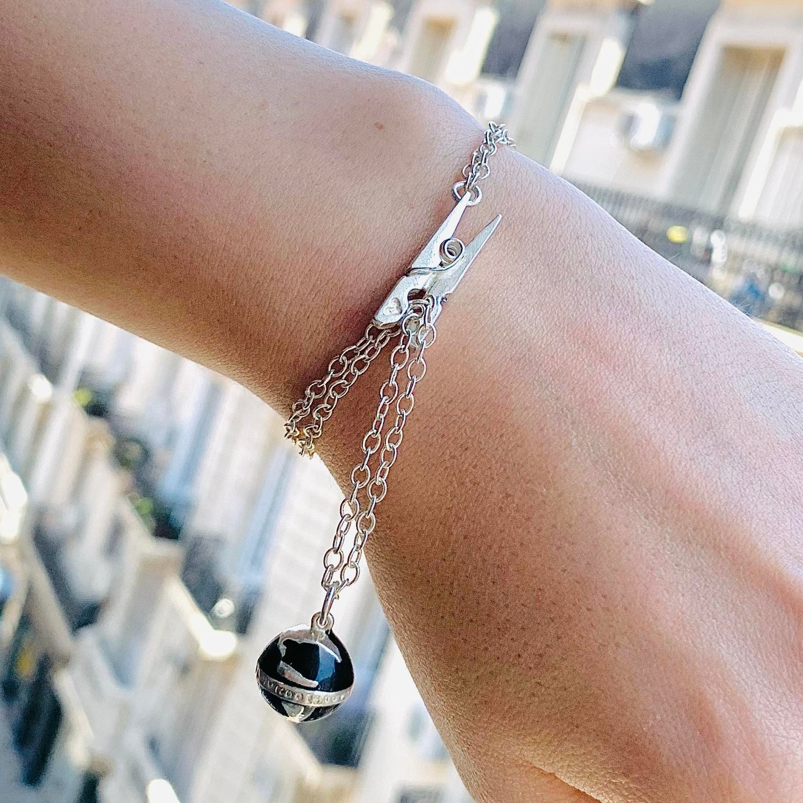 Pulsera Rolito con dije Mundo Cierre Percha Negro Plata 925