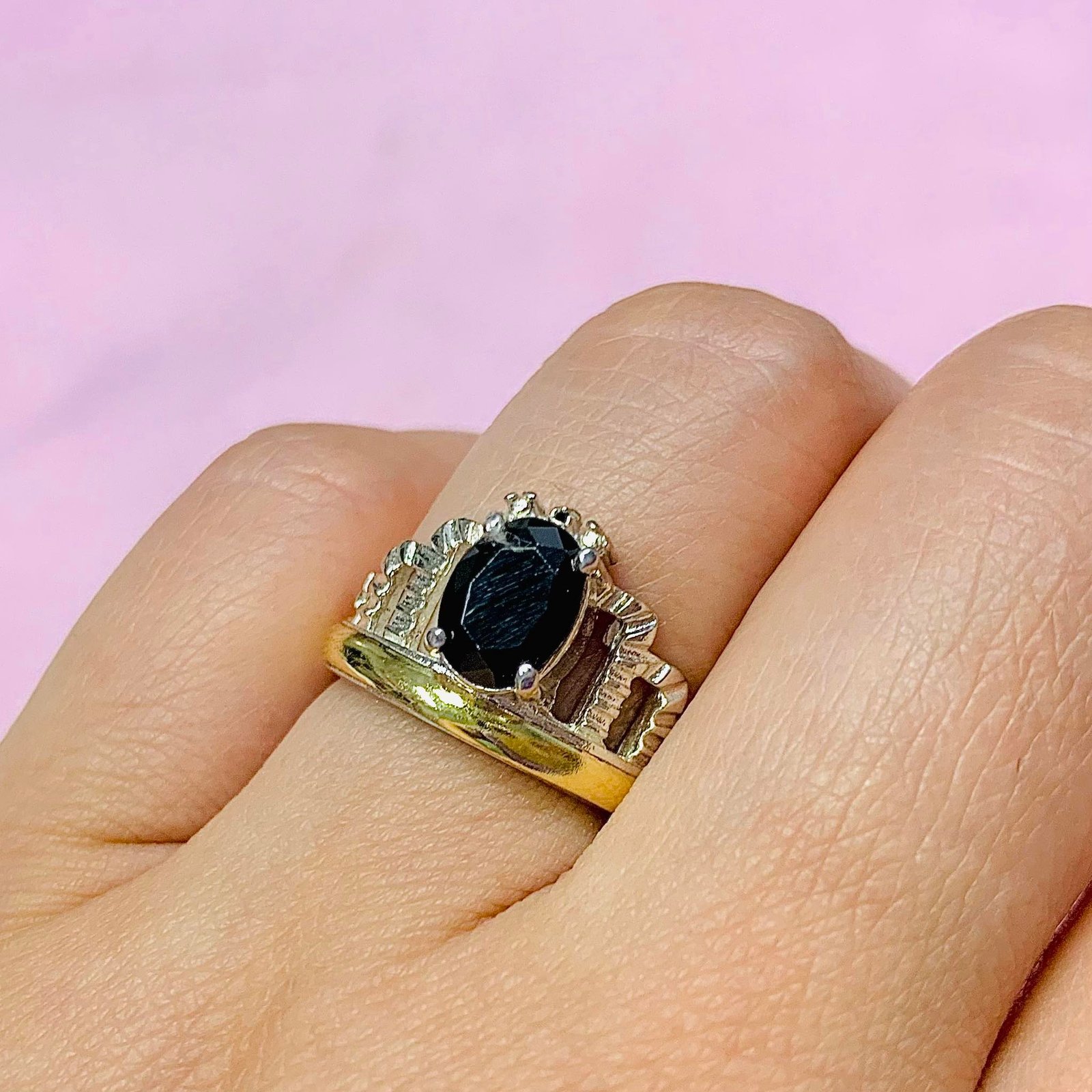 Anillo corona con cubic ovalado Negro Plata y Oro