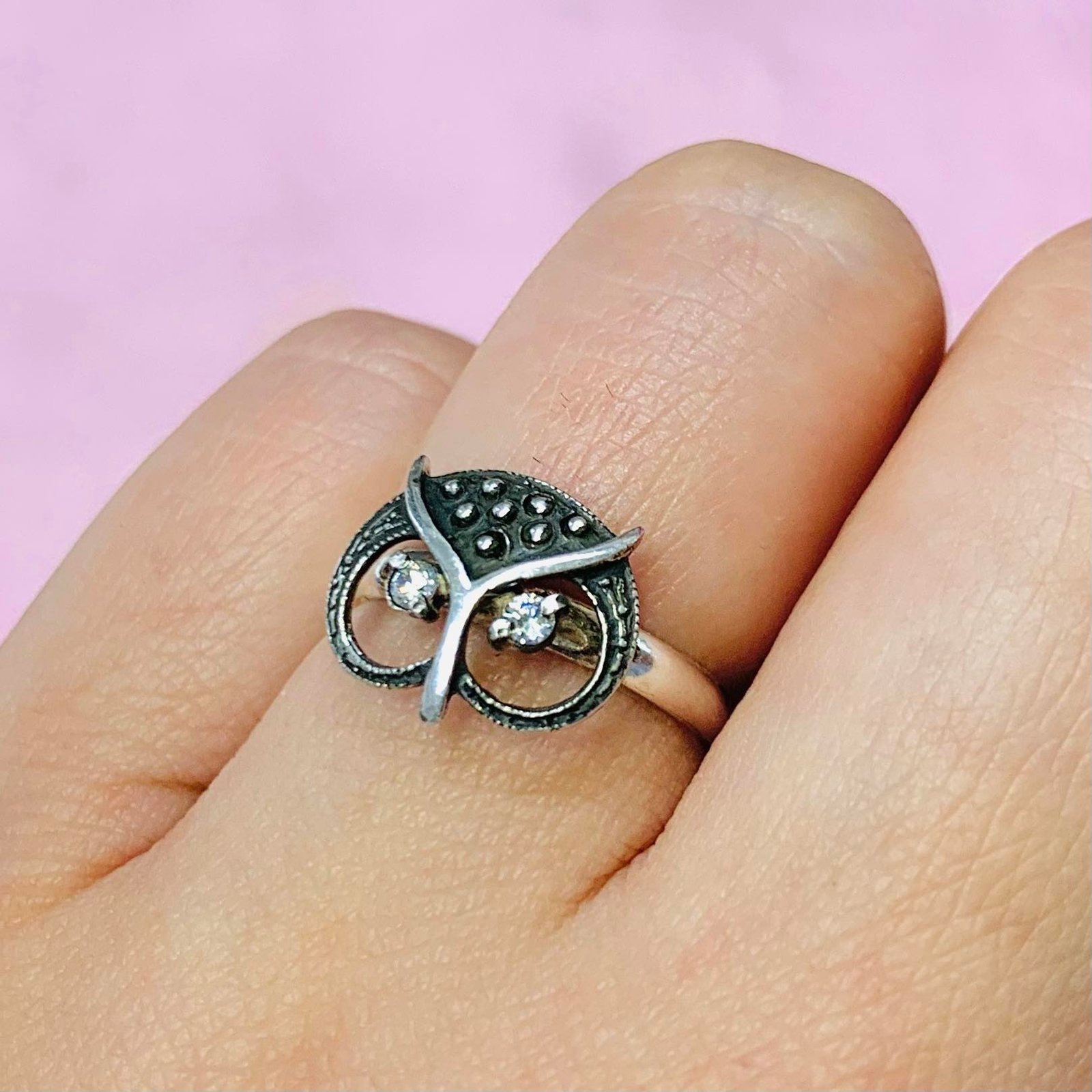 Anillo Cara Buho con Piedra Blanca enpavonado Plata 925