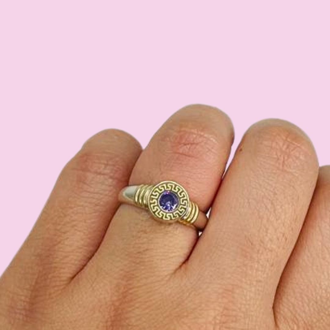 Anillo guarda griega chico con cubic Amatista 5mm Plata y Oro