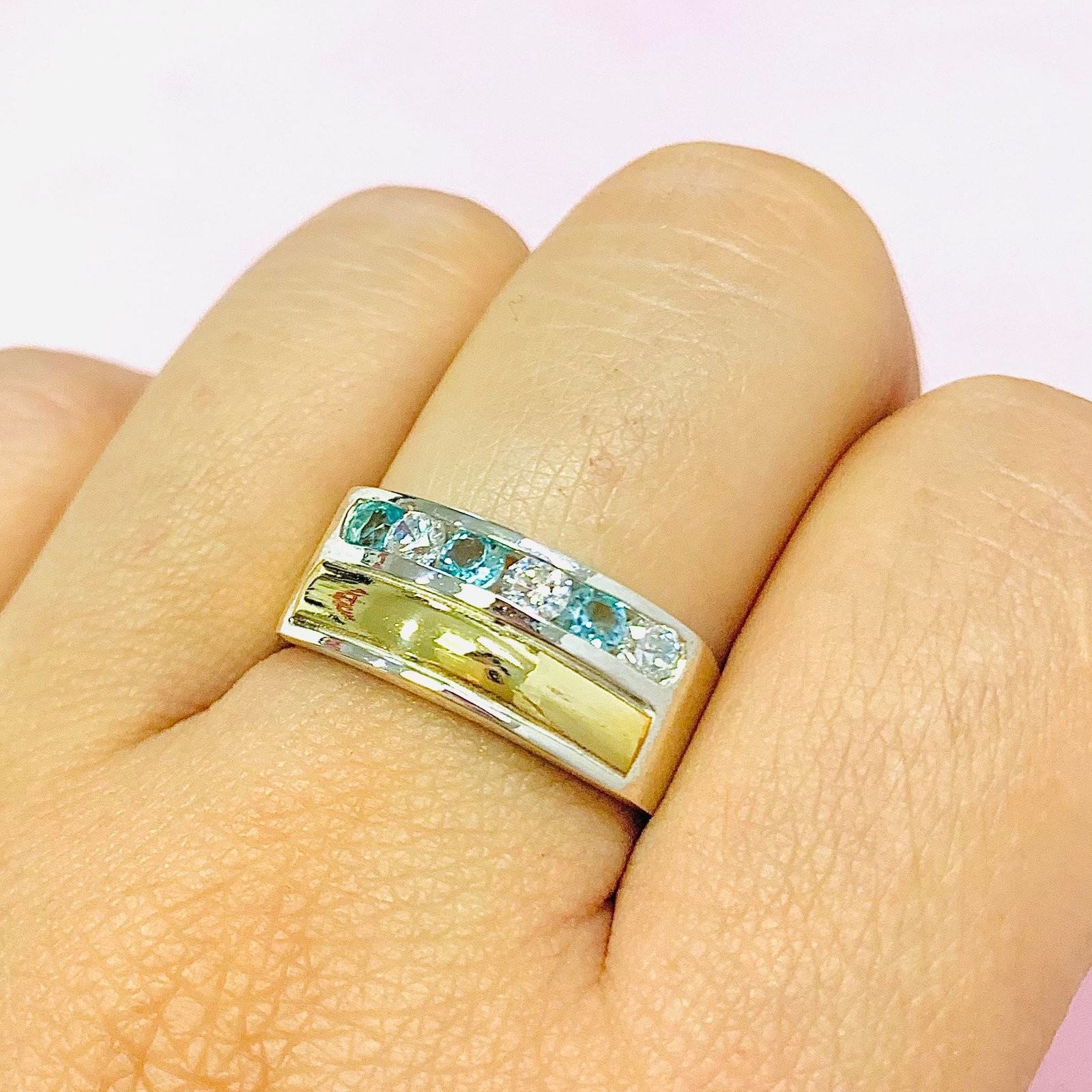 Anillo Medio sin fin Ancho con piedras Celeste Plata y Oro