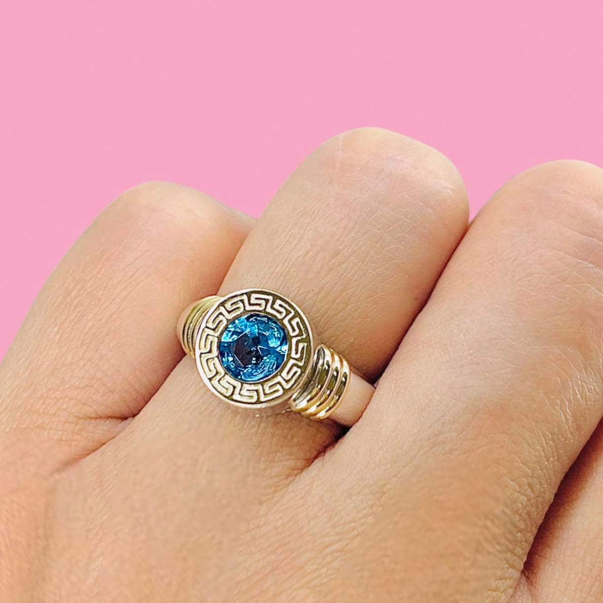 Anillo guarda griega mediano agua marina de Plata y Oro