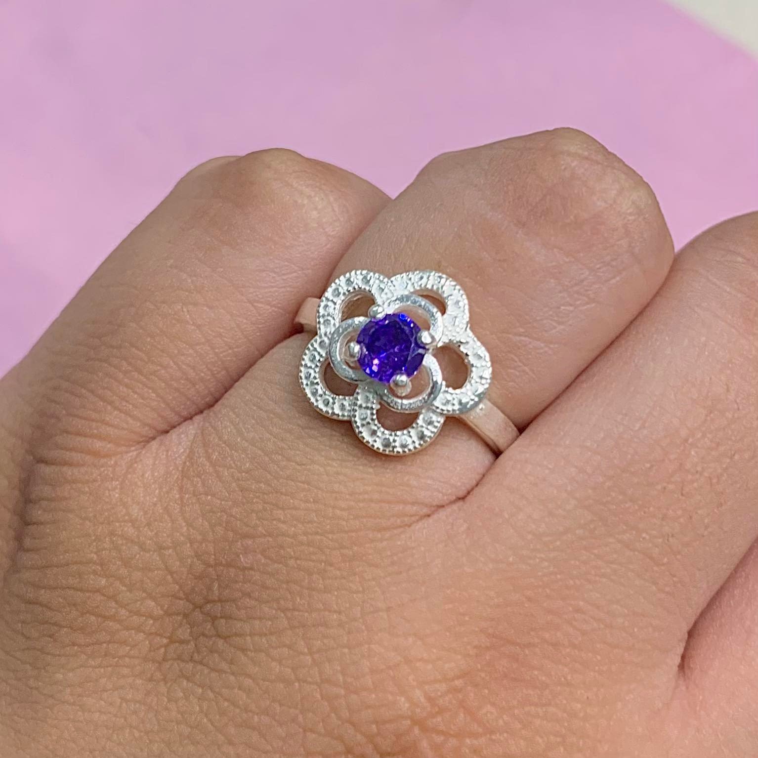 Anillo Flor con Piedra Amatista de Plata 925