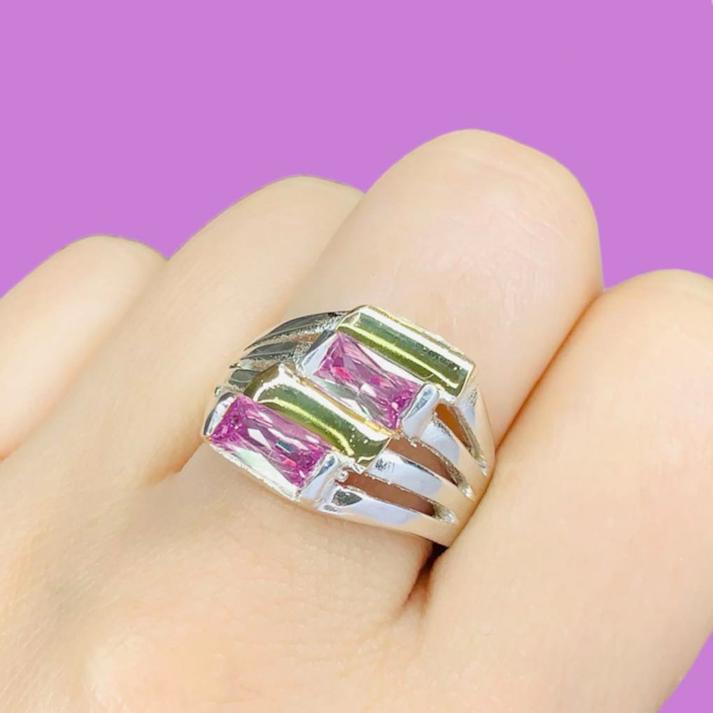 Anillo Greta con Piedra Rectangular Rosa de Plata y Oro